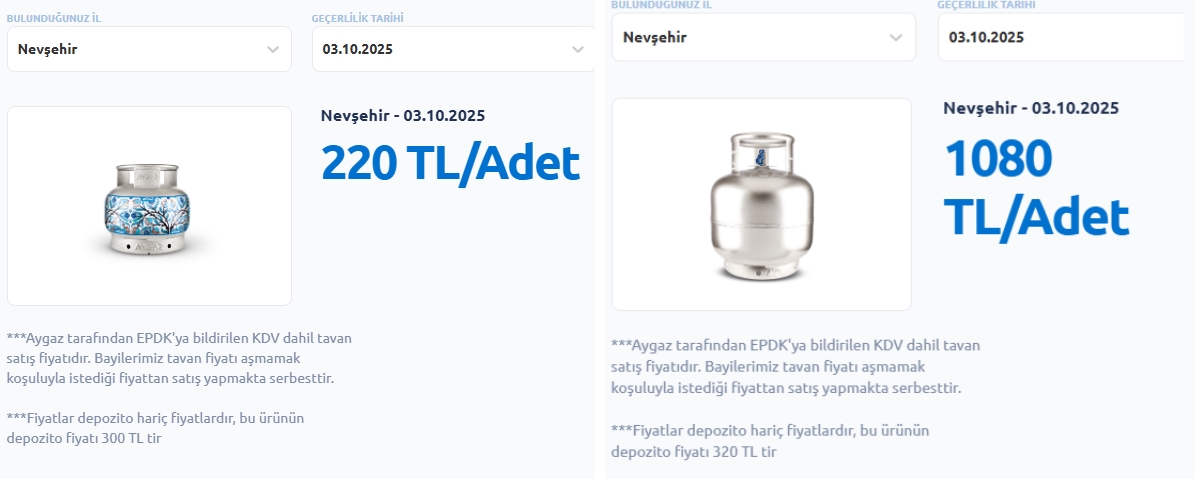 Daha önce 210 TL olan küçük mutfak tüpünün yeni satış fiyatı 10 TL’lik artışla 220 TL’ye yükseldi.(Aygaz)